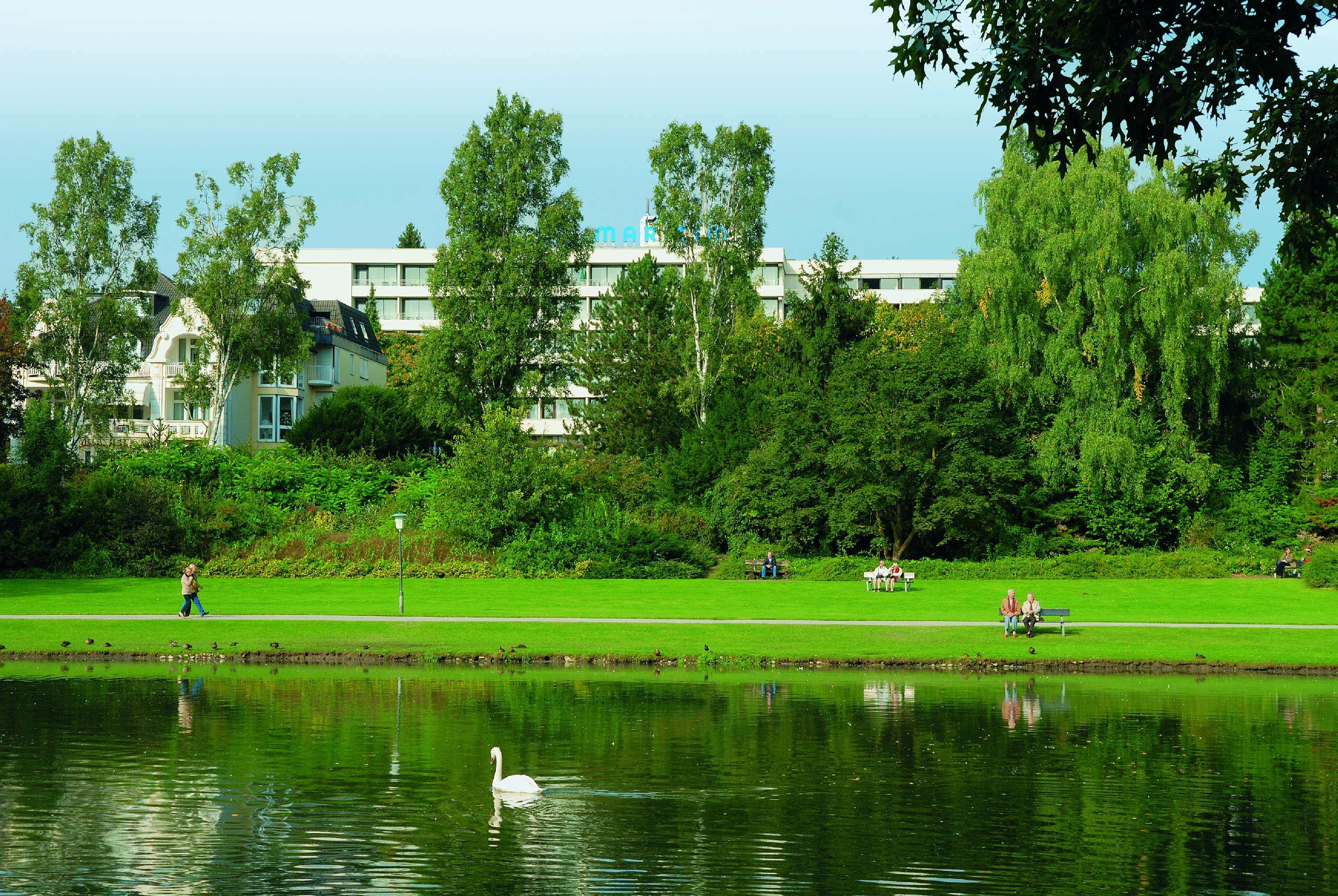 View of Maritim Hotel Bad Salzuflen behind the green spa park with lake and swan