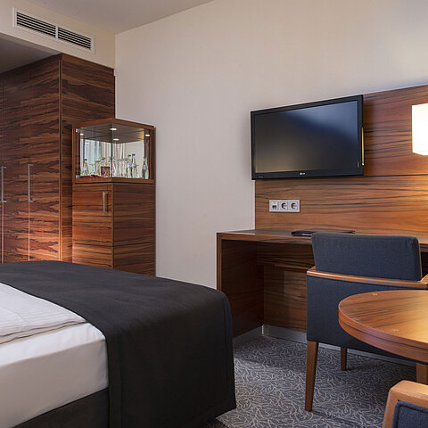 Furnished hotel room at the Maritim Hotel Munich with a comfortable bed, workspace, TV, and wood paneling.Cosy room with double bed, desk and suitcase at the Maritim Hotel MunichSpacious suite with living room, dining table and separate bedroom at Maritim Hotel Munich