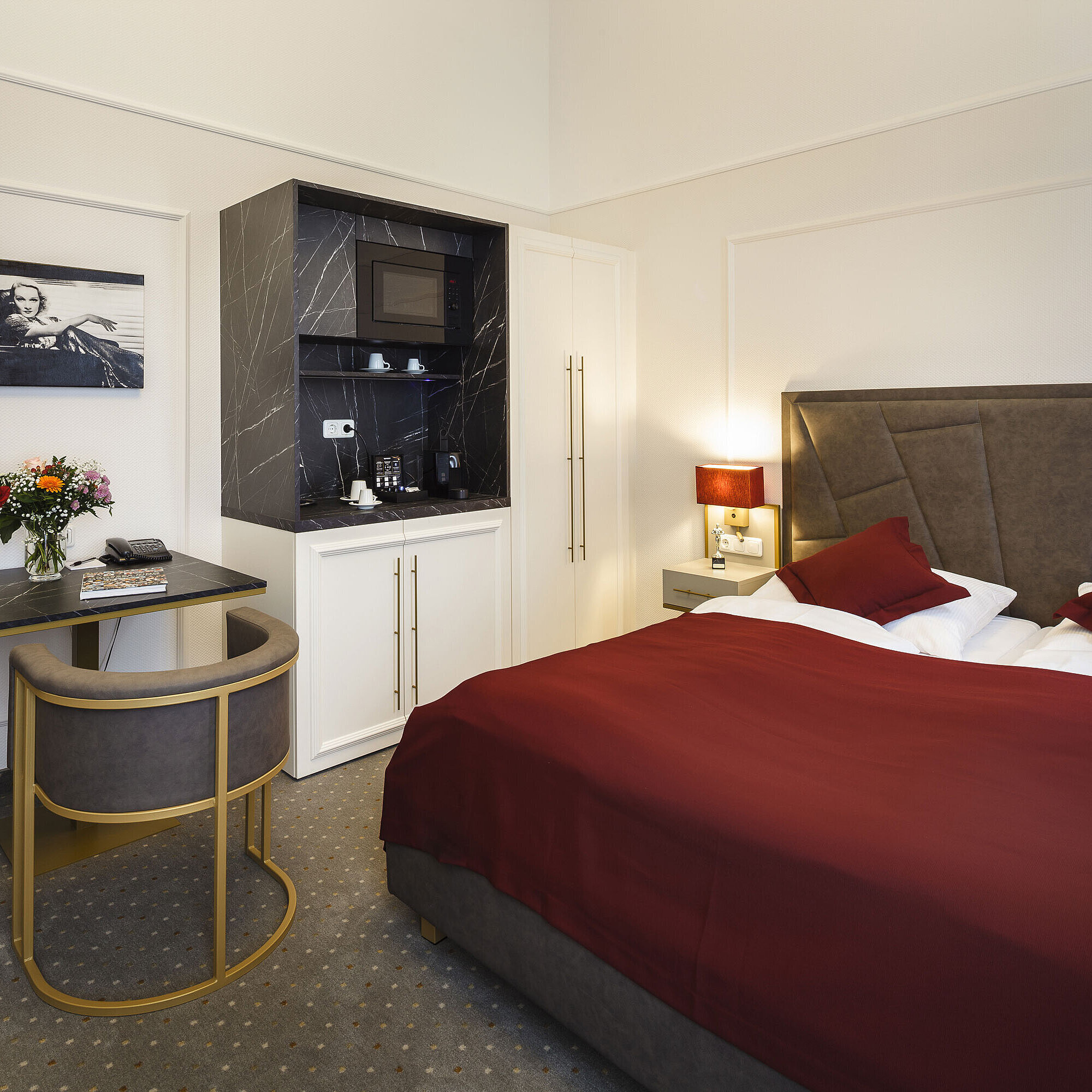 Es bueno saberlo: Todas las habitaciones y suites del hotel disponen de microondas, minibar y wifi gratuito. El minibar está incluido en el precio de cada habitación. Si reserva directamente (no a través de sitios web de terceros), se le rellenará como huésped del Hotel Wiesbaden todos los días de forma gratuita. Así que quédese aquí y reserve su estancia en Wiesbaden al mejor precio.