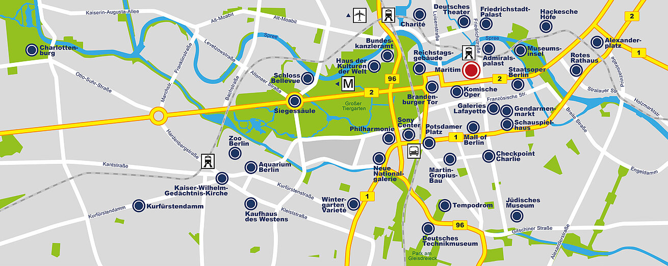 Le Maritim proArte Hotel jouit d'une situation centrale entre la porte de Brandebourg et la place Gendarmenmarkt, sur la Friedrichstrasse. L’entrée principale et l’entrée du parking souterrain se trouvent dans la rue Dorotheenstrasse. Nombre des attractions de la ville sont facilement accessibles à pied depuis l'hôtel : le théâtre Friedrichstadt-Palast, l'île des Musées, le bâtiment du Reichstag, la rue commerçante Unter den Linden, divers autres théâtres et bien plus encore.
