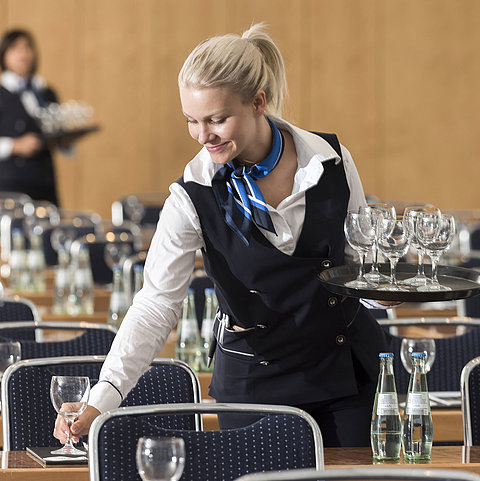 Une employée de serviceprépare une salle de conférence, portant un plateau de verres et disposant des bouteilles d'eau.